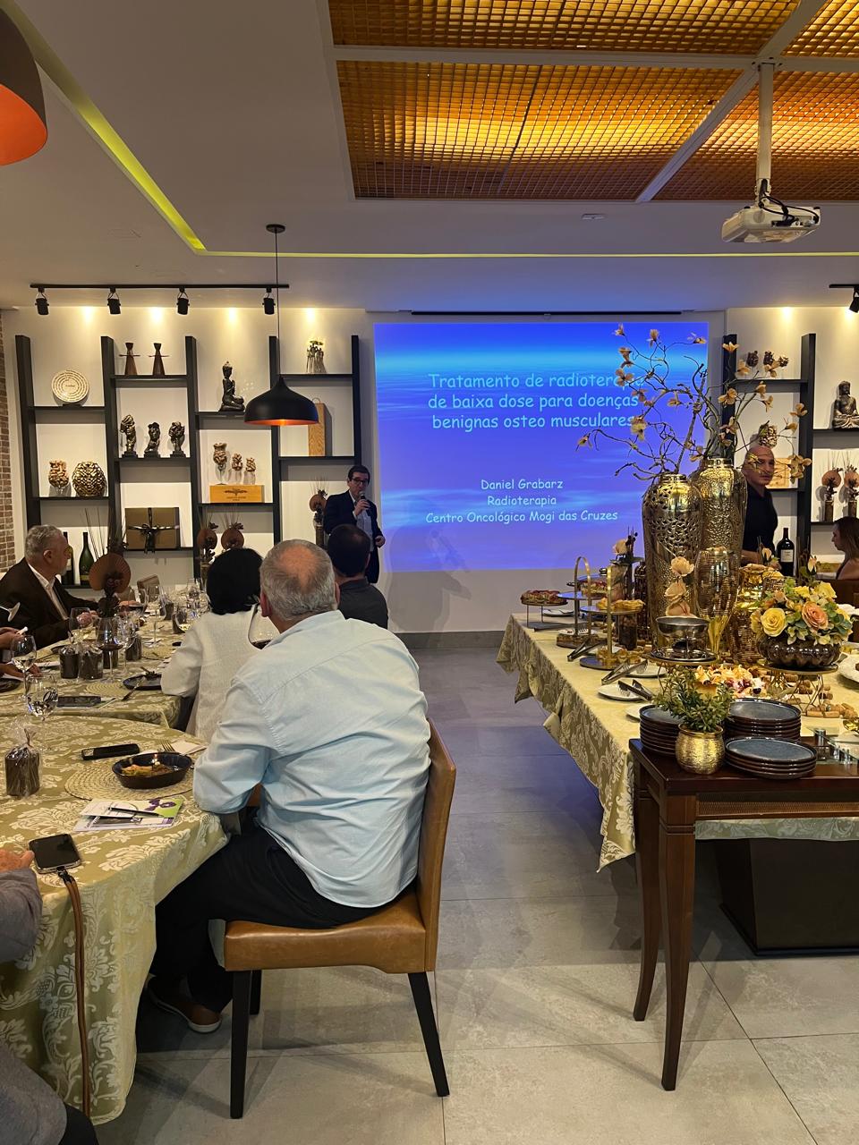 Na sequência, o Dr. Daniel Grabarz, radio-oncologista do Centro Oncológico Mogi das Cruzes, trouxe a palestra “Radioterapia de baixas doses em doenças benignas”, tema que vem ganhando relevância internacional. O especialista apresentou evidências científicas e aplicações clínicas da técnica, que tem se mostrado eficaz no tratamento de diversas condições benignas, especialmente musculoesqueléticas, contribuindo para o alívio da dor e melhora funcional dos pacientes.