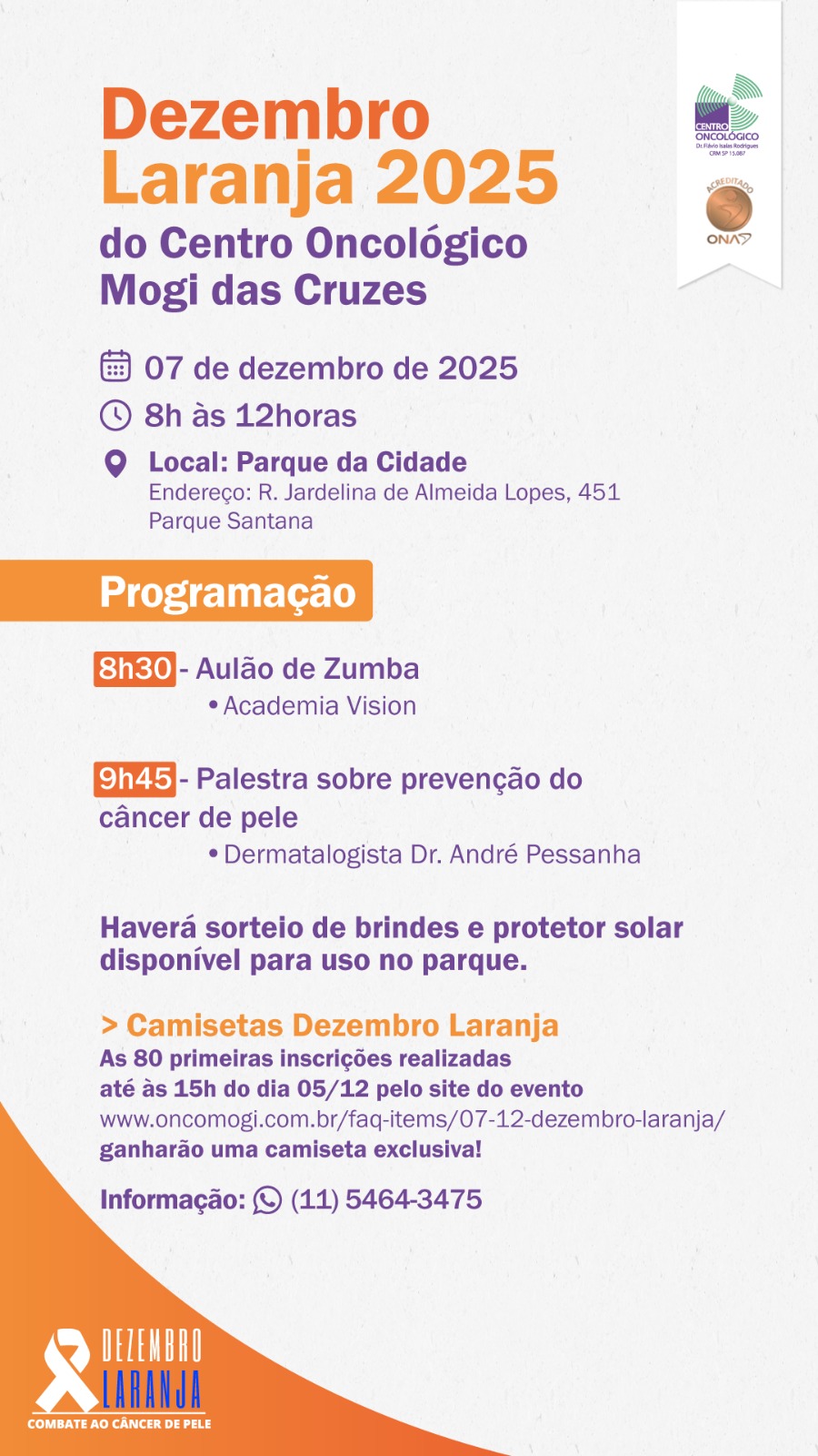 O Centro Oncológico Mogi das Cruzes convida você para participar do Dezembro Laranja 2025, um encontro especial dedicado à conscientização e aos cuidados com a saúde da pele.
