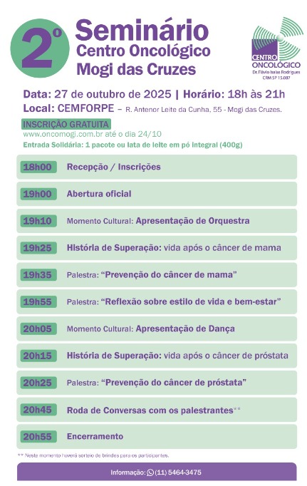 O 2º Seminário do Centro Oncológico Mogi das Cruzes é um encontro voltado à conscientização sobre o câncer e à valorização da vida após o tratamento. Com uma programação que une informação, histórias de superação, cultura e cuidados com o bem-estar, o evento promove uma reflexão profunda sobre prevenção, estilo de vida saudável e apoio emocional ao longo da jornada oncológica.